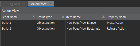 - Action View: The Action View pane lists all instances of bound actions, the script name if a script is being executed, the type of object the actions are linked to, the item names they are associated with, and the execution method.