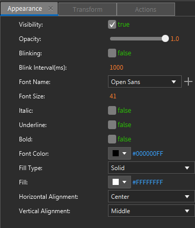 - Appearance: Visibility, opacity, blinking, fill color, stroke