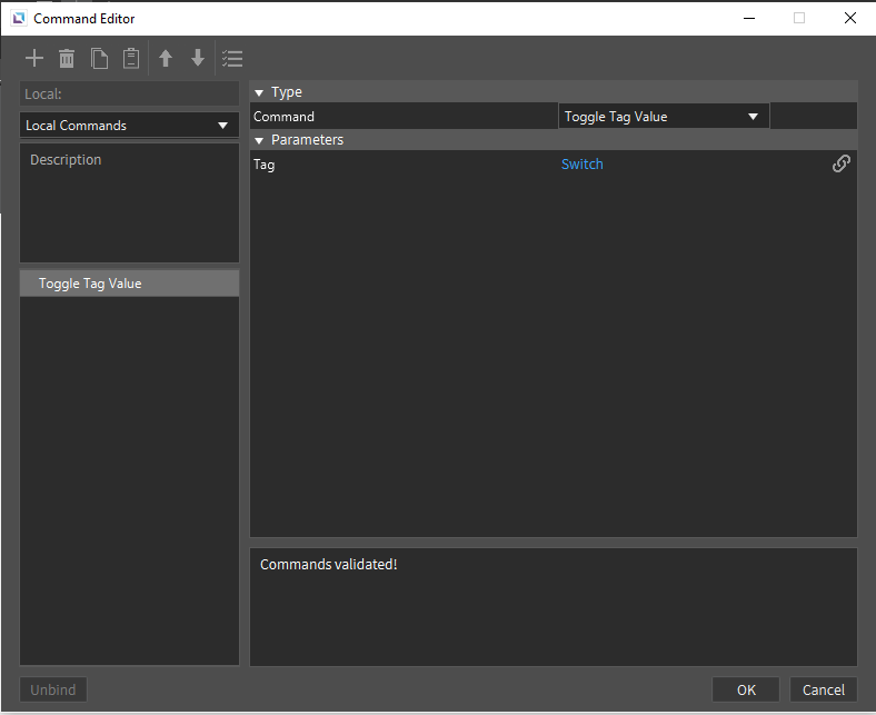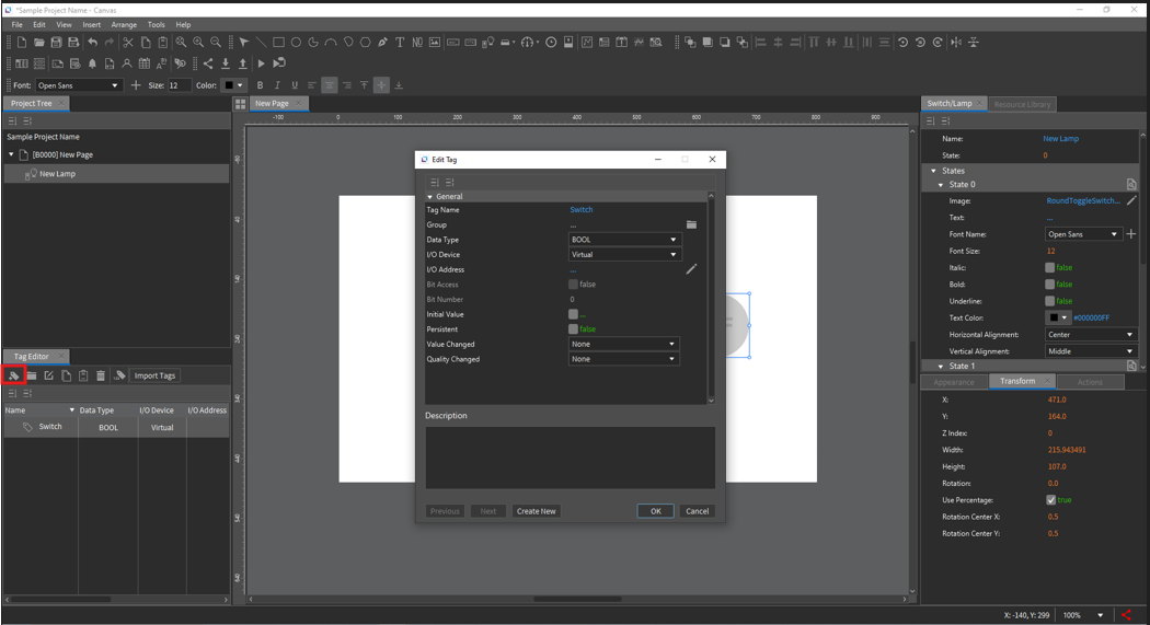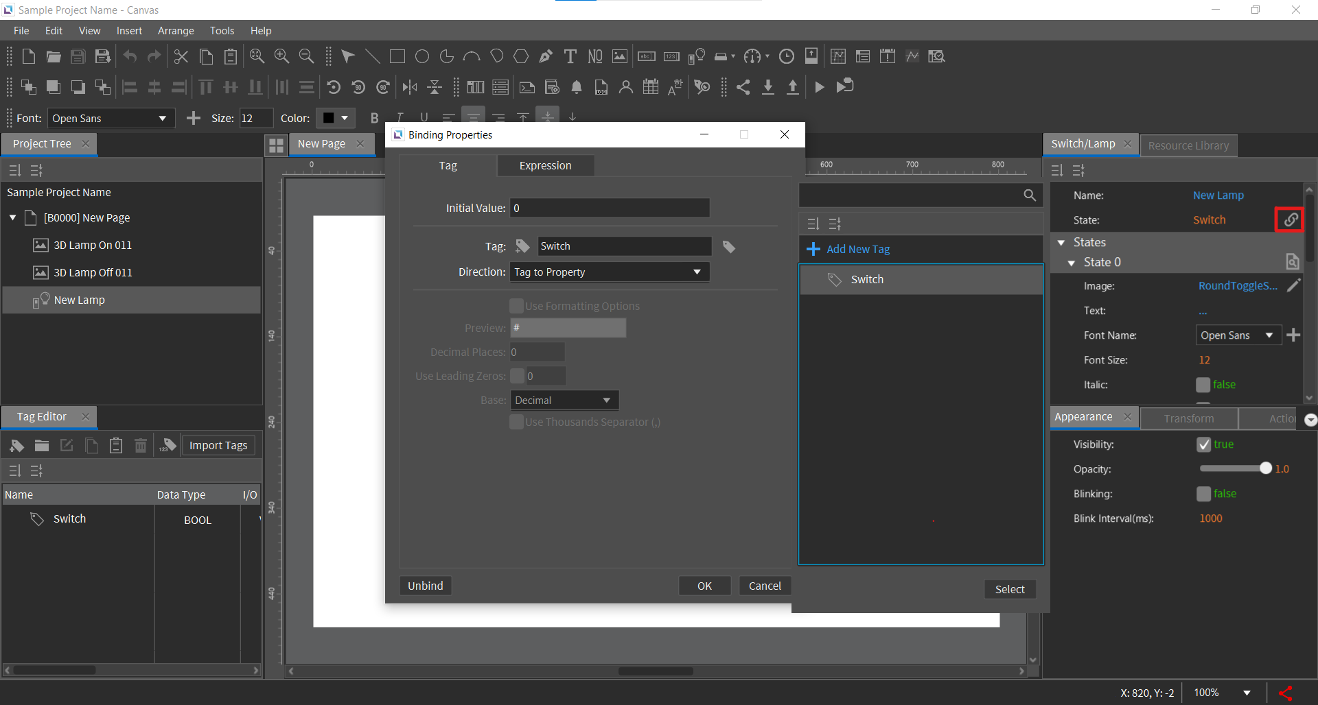 - You can use the Smart Binding feature (drag and drop the tag onto the object) or assign the bool tag to the object's properties State option by selecting the chain symbol.