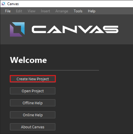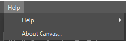 Provides access to the offline help file, online help file, and the about section, which displays the current version of Canvas.