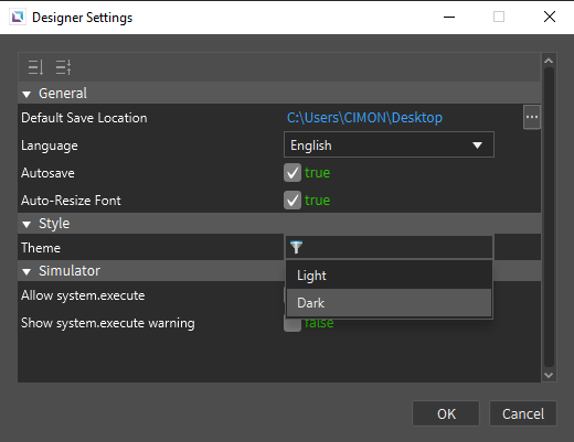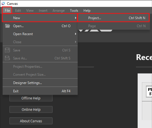 Upon launching Canvas, the welcome page displays all recent projects. To begin, click File in the top-left corner. The dropdown menu lets you access the designer settings and switch between light and dark themes.