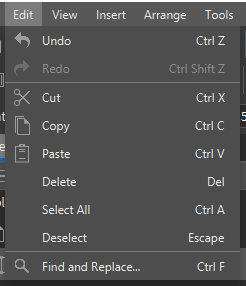 Provides essential editing functions such as undo, redo, cut, copy, paste, delete, select all, deselect, and find & replace.