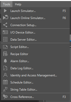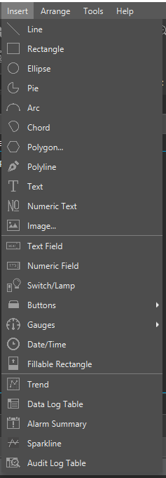 Used for adding drawing objects, text, numeric text, buttons, gauges, date/time fields, fillable rectangles, and essential components like trends, data log tables, alarms, sparklines, and audit log tables.