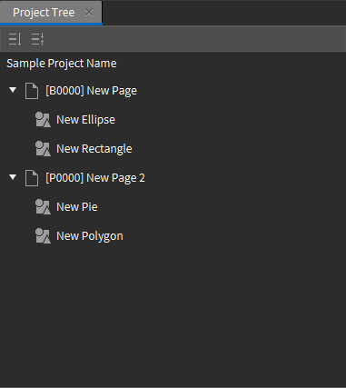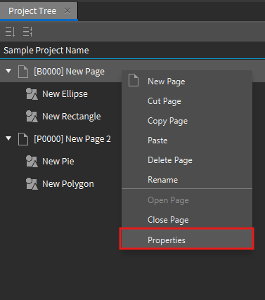 - Left Navigation Pane (Project Tree): This pane displays all base and pop-up pages and objects on each page. Options include creating new pages, cutting, copying, pasting, deleting, renaming, opening/closing, and modifying page properties.