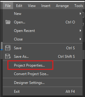 Once a project is created, the main workspace appears. Navigate to File > Project Properties to configure project settings, including page settings, runtime, identity and access management (IAM), passwords, audit log, email (SMTP), and remote page control.