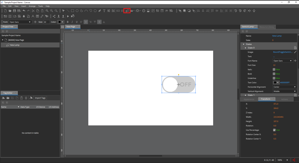 To add an object to the page, select it from the toolbar and place it on the workspace. For example, click the Switch/Lamp object and place it on the page.