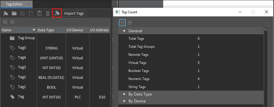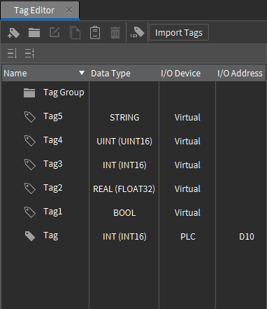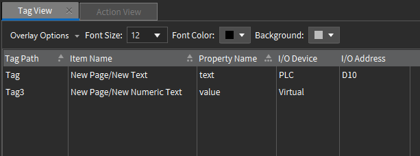 - Tag View: The Tag View pane shows all bound tag paths, the item names associated with the tags, the property type, the I/O device, and the assigned I/O address, if applicable.