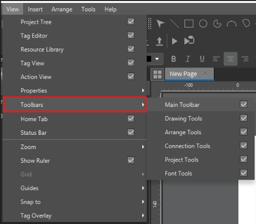 To access the toolbars, enable the sections under View > Toolbar, including the Main toolbar, Drawing toolbar, Arrange tools, Connection tools, Project tools, and Fonts.