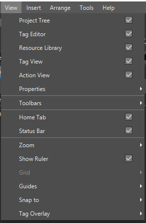 Allows interface customization, enabling features like Project Tree, Tag Editor, Resource Library, Tag View, Action View, Properties Panel, Toolbars, Zoom, Ruler, Grid, Guides, and Tag Overlay.